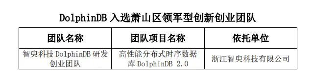 8月12日消息,近日,浙江智臾科技有限公司(簡稱 DolphinDB)作為自主研發新一代高性能分佈式時序數據庫的創新型科技公司,成功獲評2021年度蕭山區領軍型創新創業團隊。