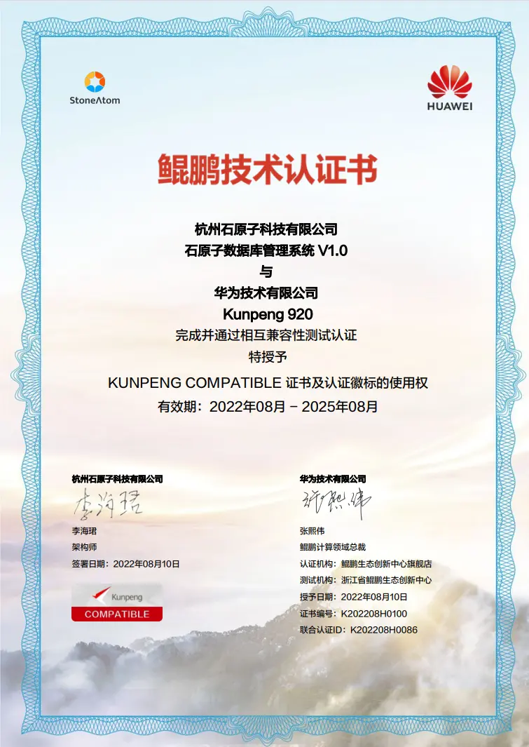 8月10日,石原子科技一體化實時 HTAP 數據庫StoneDB與華為鯤鵬 920 已完成兼容性測試認證。該認證意味着 StoneDB 在兼容性、穩定性、性能、安全、功耗、功能等六大維度的測試均符合鯤鵬技術標準,可以適配華為鯤鵬 920 處理器。