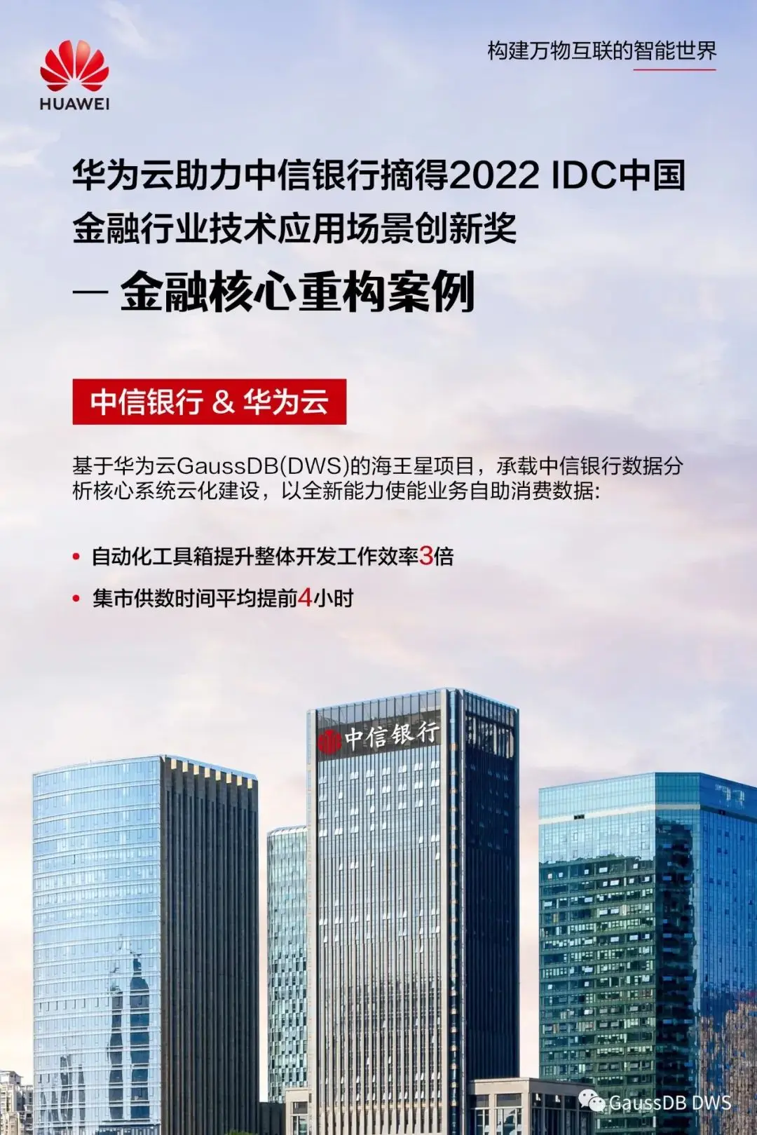 8月18日,IDC中國在北京舉辦了第十屆“中國數字金融論壇”,公佈了2022年度“中國金融行業技術應用場景創新案例大獎”。中信銀行基於華為雲數據倉庫GaussDB(DWS)建設的海王星項目榮獲 “金融新基建—金融核心重構”優秀案例。
