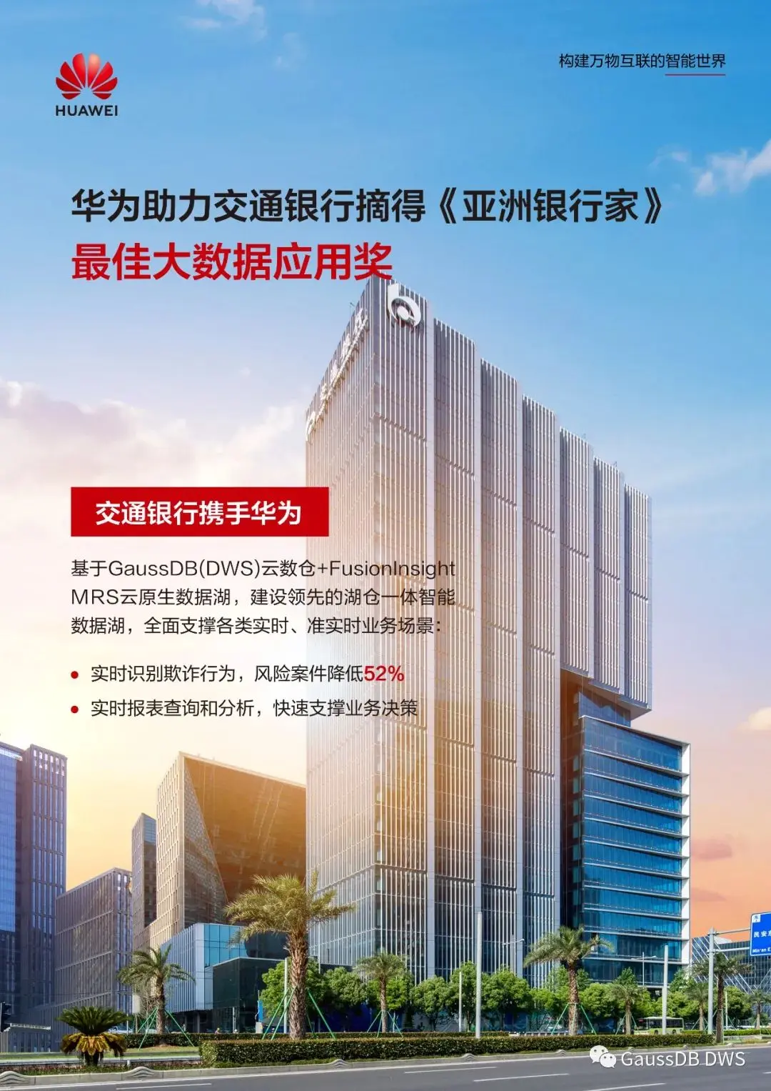 8月25日,國際權威財經雜誌《亞洲銀行家》在2022中國未來金融峯會上揭曉了“2022年度金融技術創新獎”評選結果。交通銀行基於華為雲 GaussDB(DWS) + FusionInsight智能數據湖建設的“湖倉一體的數據中台實踐”榮獲“最佳大數據應用”獎。