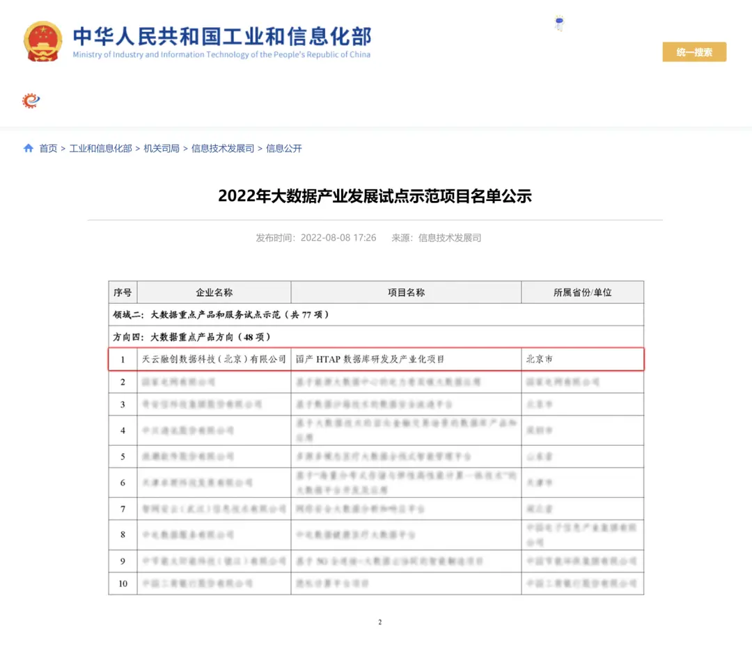 - 天雲數據 Hubble 數據庫獲得國家級重點項目推薦,作為HTAP國產數據庫入選工信部 “2022年大數據發展試點示範項目名單”。