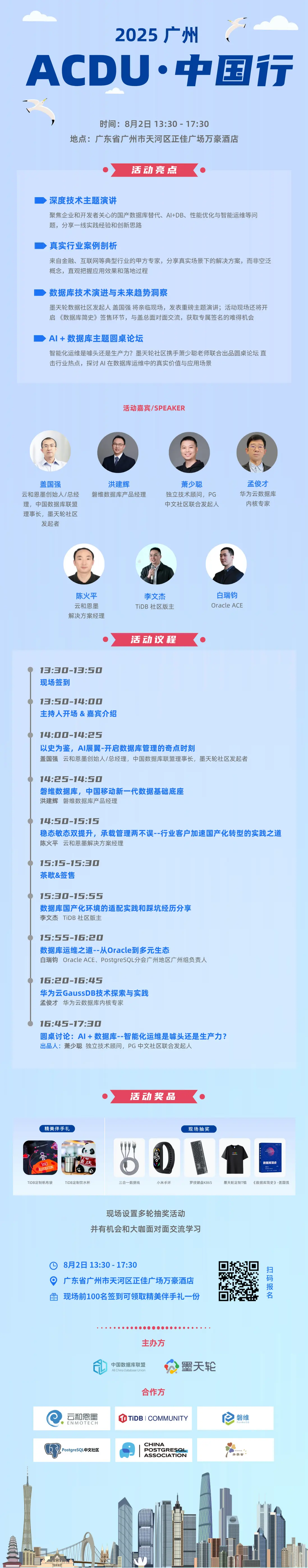 本期由墨天輪社區主辦的【ACDU·廣州站】將於8月2日正式開啓,以「數據庫升級實戰:國產替代與智能運維的落地指南」為主題,匯聚行業精英,通過深度主題演講、真實行業案例剖析、專家圓桌對話,共同探索數據庫技術的前沿應用與實戰經驗,助力企業和開發者在數字化轉型、國產化替代的道路上邁出堅實步伐。
