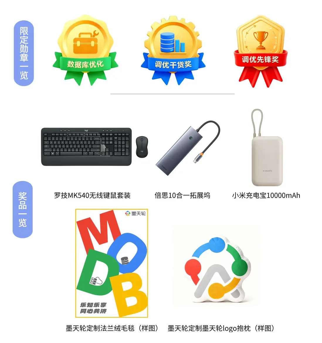 | 調優乾貨獎 | 若干篇 | 調優乾貨限定勳章(虛擬)+實物獎品(以下獎品可二選一):1、墨天輪定製法蘭絨毛毯; 2、墨天輪定製墨天輪logo抱枕 |
