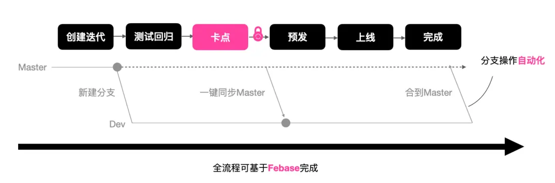 我們期望 GraphQL 應用的研發流程應該和普通應用的研發流程一樣,當開發者接到需求時,他需要在平台創建迭代,我們會為它分配分支和環境,當他測試迴歸完成後,需要進行一些卡點,我們會在卡點環節提供一些語法校驗以及變更的 Review,經過卡點流程後,開發者就會進入獨佔的上線通道,完成線上發佈和驗證後,開發者可以一鍵將開發分支合併到 master。