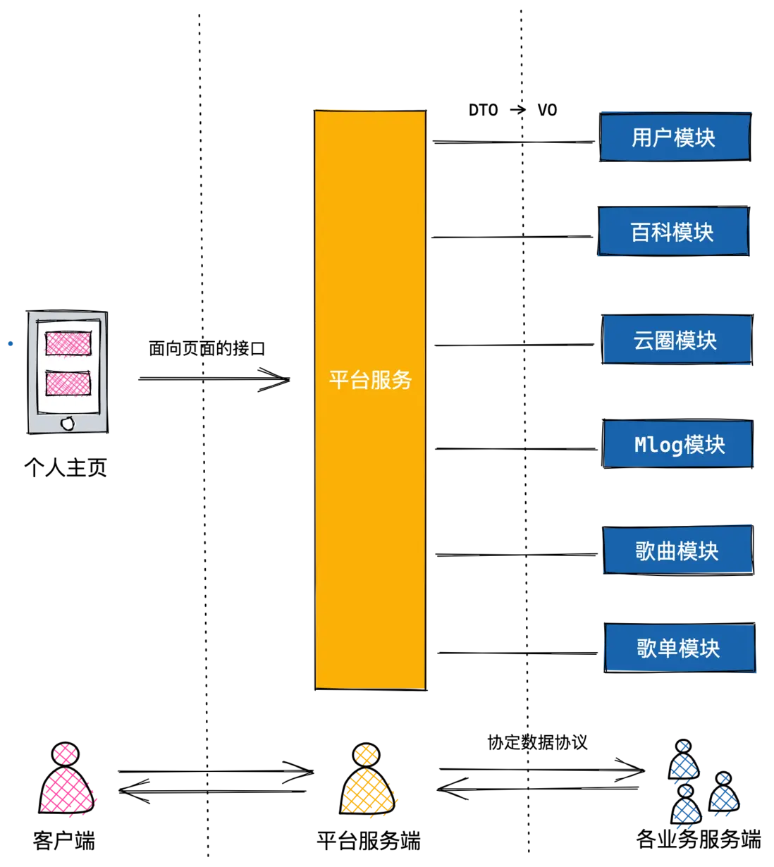 在年初,我們計劃針對雲音樂的P0頁面,個人主頁進行改版,雲音樂的個人主頁聚合了來自各個頁面領域的數據,比如用户個人信息,Mlog,雲圈,K歌等等,這些數據來自於各個不同的服務端團隊。對大前端同學來説,我們期望能通過儘量少的接口調用獲取到這些數據,以保證頁面性能,同時,我們期望獲取的數據接口能和頁面 UI 高度適配,不需要在端上進行太多的數據轉換。因此,服務端同學為我們抽離了一層獨立的中間服務,負責聚合各個業務的接口數據,同時,我們需要各個業務服務端將業務領域的 DTO 轉換為 VO,保證能和 UI 進行適配。