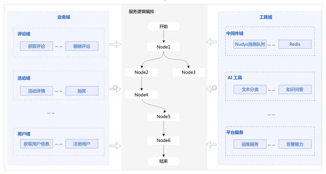 構建編排一個完整流程,主要是能夠將可被編排資源以順序、分支、循環、並行等的流程串聯,可以被編排的資源主要可以分為兩類,一類是業務域服務,一類是工具域服務,通過對對業務域服務、工具域服務的組裝、編排,可以靈活構建一套符合業務需求的服務工作流;