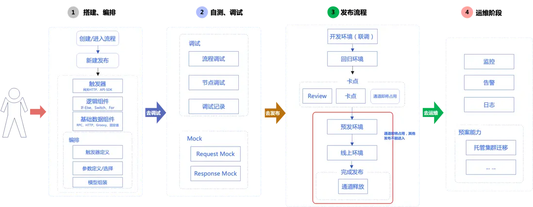 整體流程主要包括四個部分:編排搭建 -> 自測、調試 -> 發佈流程 -> 運維,如下圖所示