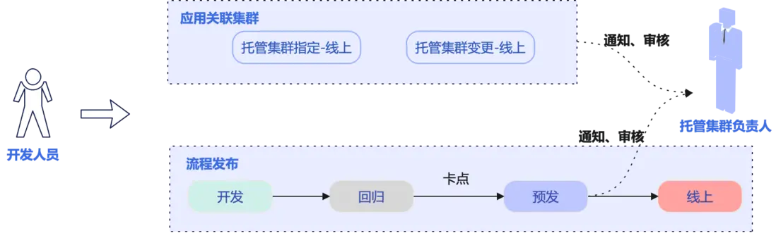 由於角色的不同,可角色分為兩大類:託管集羣負責人,開發角色,同時為了集羣的穩定性,會涉及到審批和通知,便於集羣負責人對容量和穩定性進行把控,所以需要應用關聯到託管集羣和流程發佈時通知到託管集羣負責人、或需要託管集羣做審核,簡單示意圖如下:
