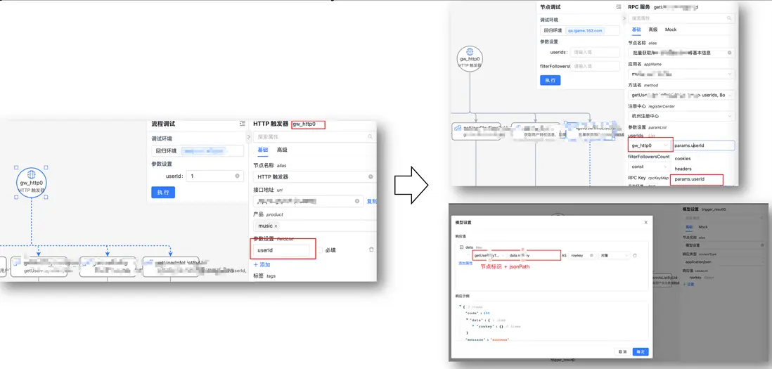 舉個具體的例子:定義在觸發器中gw\_http0中的一個參數userId,可以在下游RPC調用中被選擇作為RPC的入參,另外也可以在結果集整合的時候作為結果被使用,在下面這個case中,是通過節點標識取到的該節點返回之中的data.rowkey信息作為返回結果的一部分;