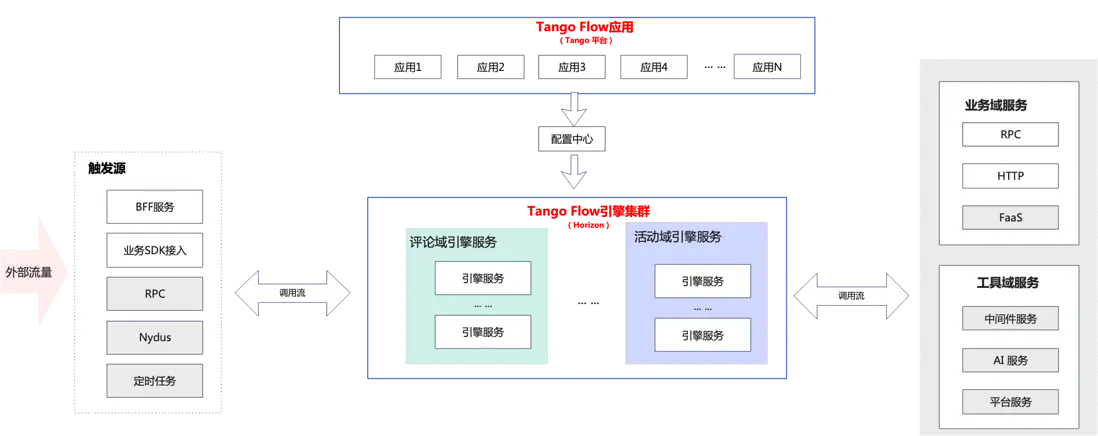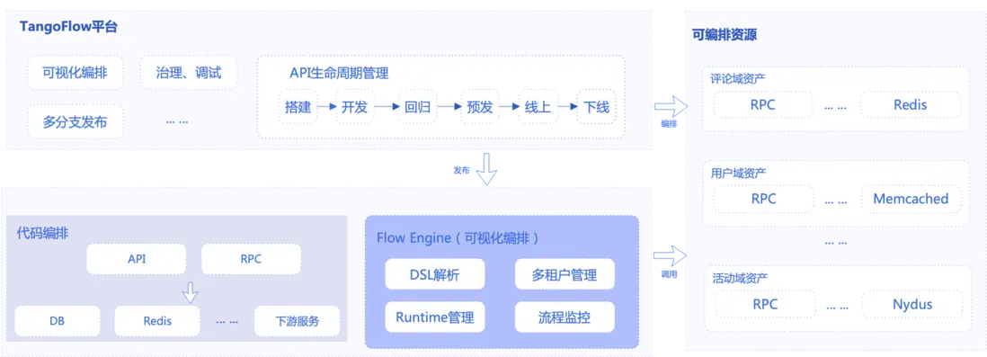 當前的工具領域沉澱比較弱且很分散,期望能以Tango Flow項目為契機沉澱工具域資產;整個邏輯編排是對業務域和工具域資產的編排,具體表現如下圖: