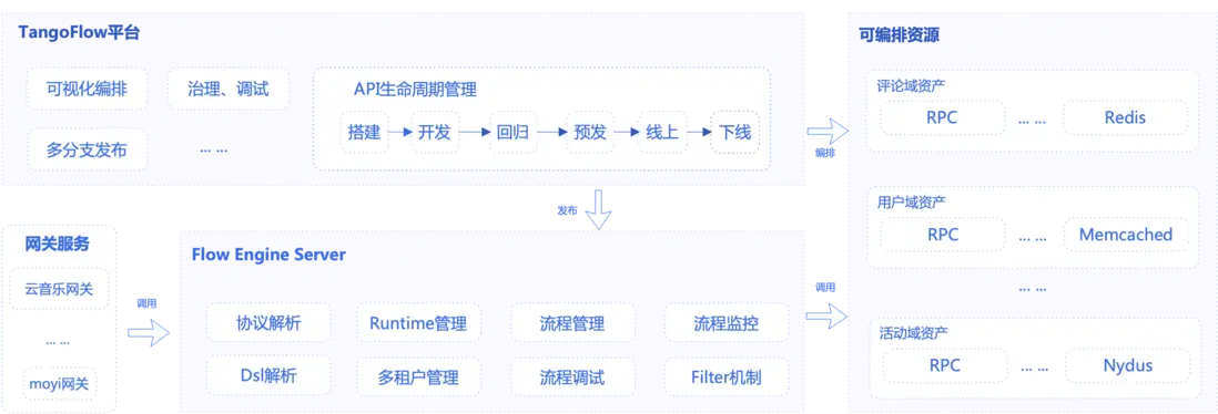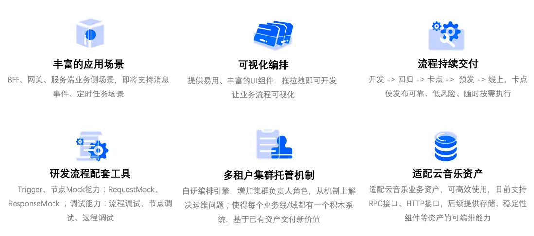 Tango Flow是雲音樂自研的流程編排平台,具有豐富的應用場景,可以用在BFF場景、服務端業務場景(統一服務端SDK),並具有場景易擴展能力;Tango Flow可通過可視化拖拉拽的方式快速搭建、測試和發佈流程,平台提供簡單易用流程搭建能力,通過組件標識+JsonPath可完成參數在流程節點之間傳遞;支持整個流程的調試、節點維度調試(RPC、HTTP、Groovy腳本)的調試能力,並且無需發佈,可指定環境、直接測試、調試記錄;建立統一的運維協作機制,發佈流水線全生命週期管理,秒級完成發佈,卡點環節使發佈可靠、低風險、隨時按需執行;具有監控告警能力,不同維度數據,不同負責人關注信息不一樣,根據訪問分佈、RT訪問分佈,並在流程維度有RT和調用錯誤率的告警;