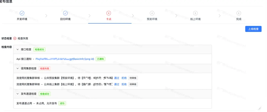 以下為一個具體case,由於公共預發集羣和線上集羣都設置了開啓審核,所以需要集羣負責人審核通過後才能繼續發佈