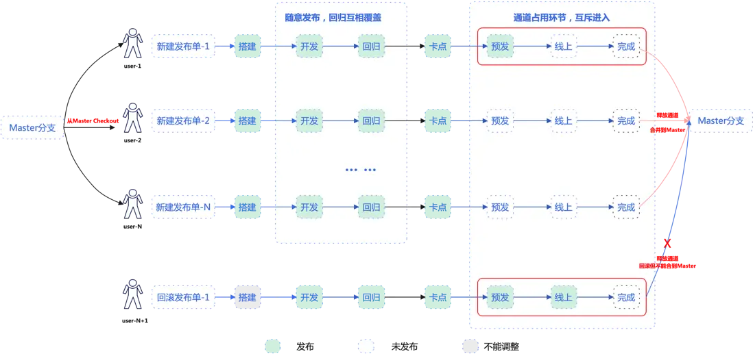 3、回滾策略:回滾發佈以新發布單形式存在,與其他共用發佈單共享發佈通道,回滾但不能合併到Master;