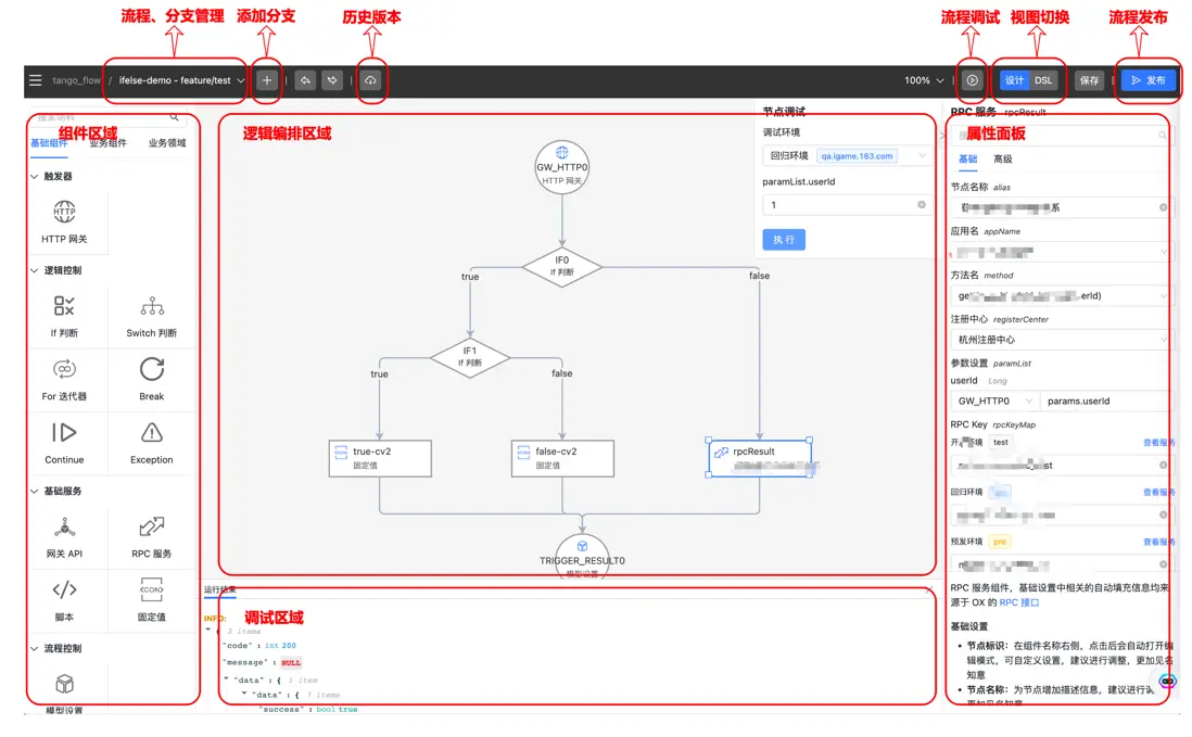 流程編排頁面是TangoFlow最核心的頁面,從區域上劃分為組件區域、邏輯編排區域、屬性面板,在調試情況下會彈出調試區域,同時支持分支切換、歷史版本、視圖切換(支持設計和DSL的切換)、流程快速發佈等能力。