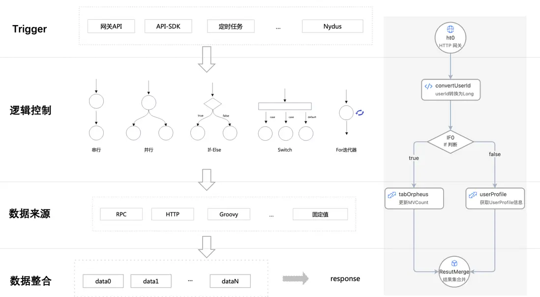 一個完整的流程包括Trigger +邏輯控制 + 數據來源 + 數據整合,下面對這幾個概念進行簡單介紹: