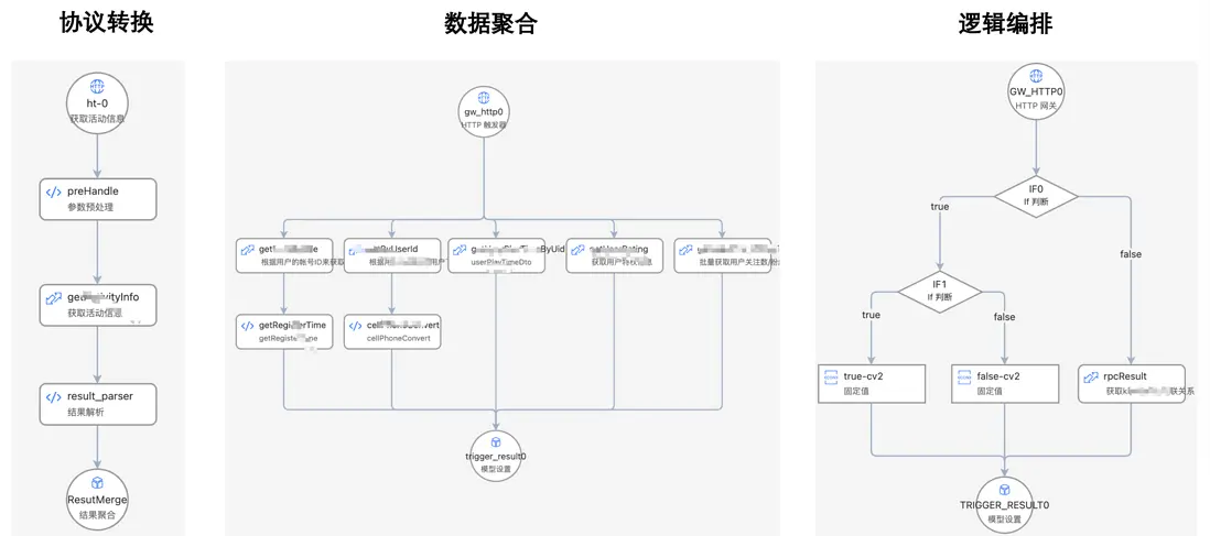 一期流程編排暴露出來的能力是網關API和API-SDK,同時支持的數據節點主要是RPC接口、HTTP接口、本地接口調用、Groovy腳本,所以一期主要適用場景在:協議轉換、數據聚合和簡單邏輯編排的場景;