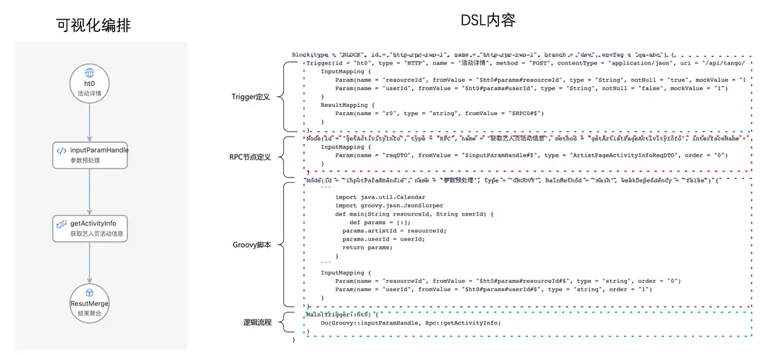DSL分為元信息定義和邏輯流程定義,元信息定義會受流程內容影響而有很大不同,在下面這個例子中,元信息定義包括Trigger定義、RPC節點定義、Groovy腳本定義,更接近編程語言,後期藉助AI Native prompt提升效率;