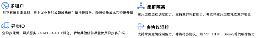 TangoFlow自研邏輯編排引擎,編排引擎是靜態流程的Runtime載體;同時也是一個邏輯概念,和使用姿勢有關係,可以服務的形式承接網關流量,也可以以SDK的方式集成在業務應用中,自研編排引擎具有以下特點: