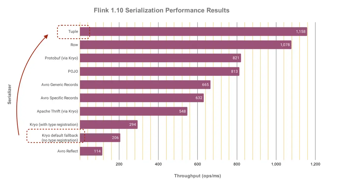 以下是Flink官方提供的各序列化的效率對比,可知Tuple序列化對比Kryo有巨大提升。