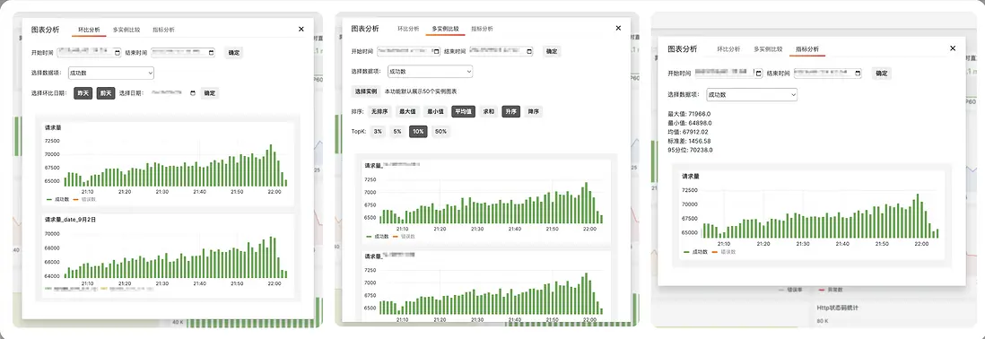 圖表分析能力:在日常故障排查中,經常需要進行時間跨度和實例之間的比較分析。我們選型的Grafana雖然對時序數據的可視化支持很好,但對圖表比較分析的支持較弱。因此我們對Grafana做了二次開發,支持了以下功能: