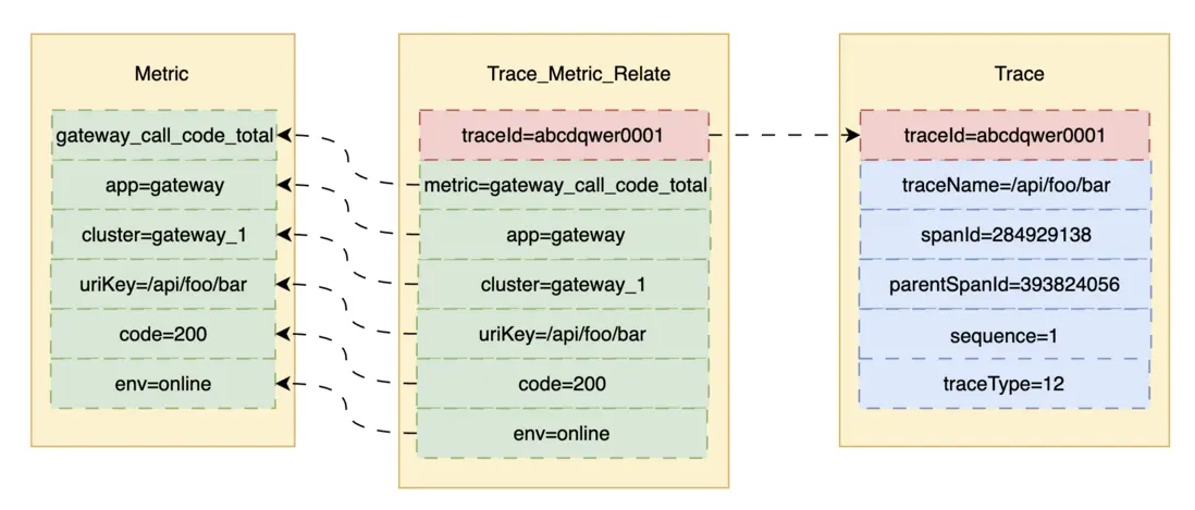 為關聯Metric和Trace,我們設計了關聯表,單獨上報存儲。我們從Metric關聯到Trace時,先通過Metric的label、value、時間範圍查出TraceId列表,隨後查出對應的Trace詳細信息。