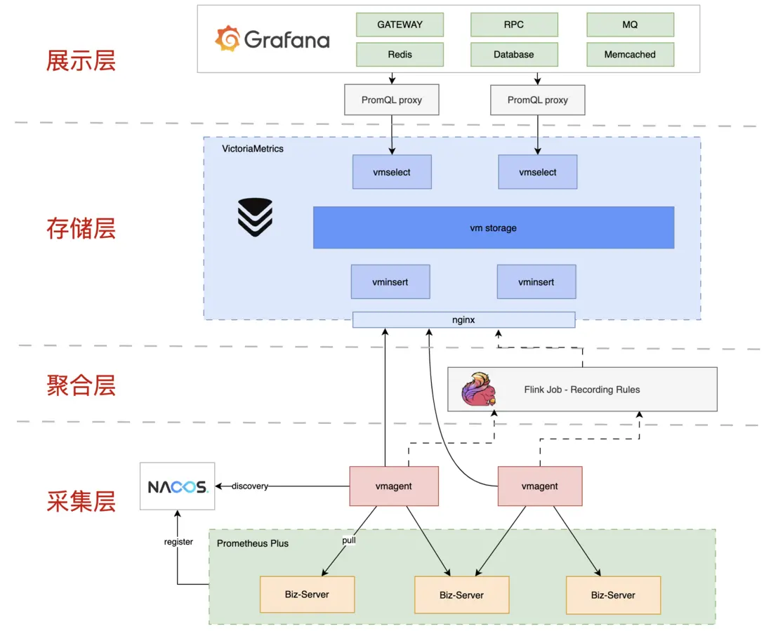 由於時序數據不斷增長的特點,數據預處理提高查詢時效率較好的解決方案。經過測試,開源方案後置聚合(數據存入存儲引擎後,再查詢出來聚合)的方式不能滿足我們的性能要求,故我們基於Flink設計實現了預聚合的Recording Rules服務,另外為了讓用户更方便地使用聚合數據,我們設計了查詢代理Proxy。