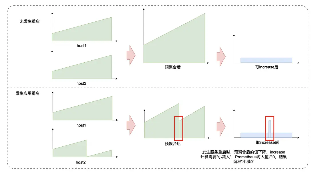 我們若按照集羣聚合,第n分鐘該集羣發佈,則會有服務的Counter被重置為0,導致整個集羣的聚合值下降。若此時我們用PromQL的rate或increase函數查詢發佈這一分鐘的值,存儲層會用n分鐘的值減n-1分鐘的值,但此時n分鐘的值大於n-1分鐘的值,即小值減大值。此時存儲層會認為該Counter被重置,基數應當為0,則變成n分鐘的值減0,得到n分鐘的值。由於集羣發佈前大概率已經累計了很長時間的Counter,此時n分鐘的值可能非常大,會導致這一分鐘的increase結果非常大,展示在圖表上為一個超大的突刺。