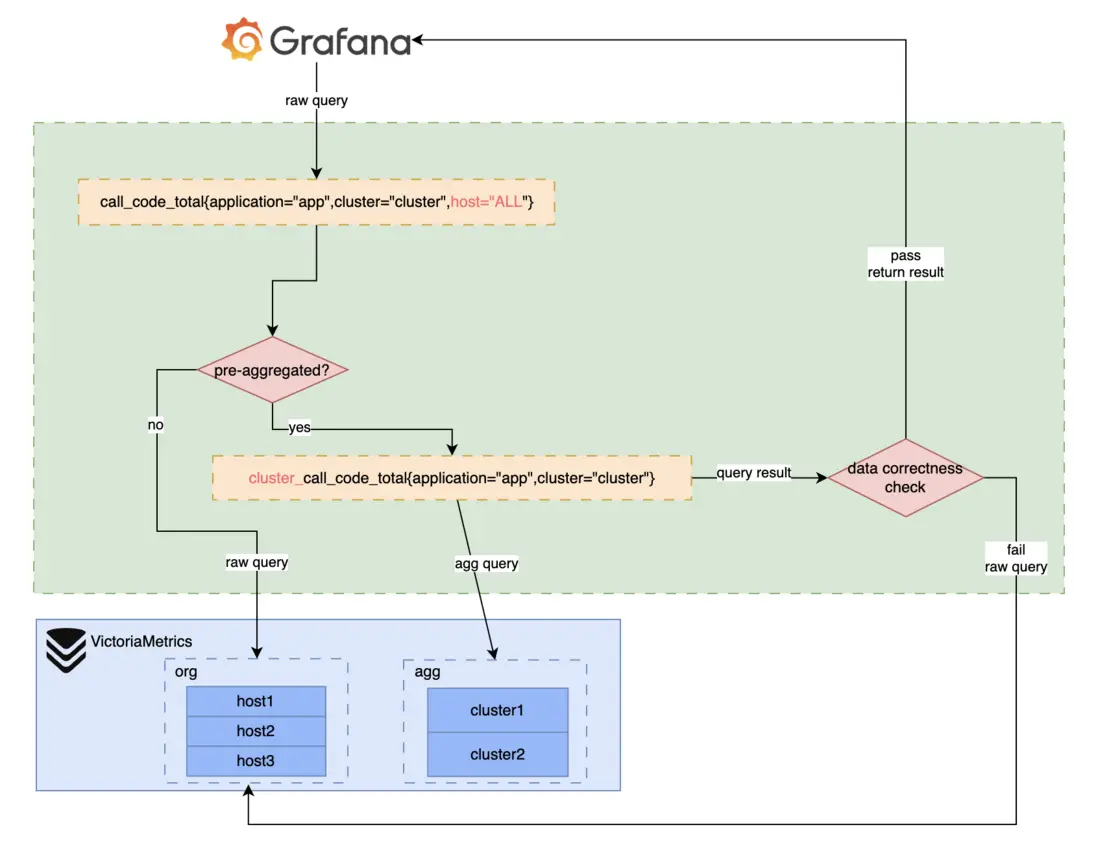 用户若要在查詢時使用聚合數據需感知聚合規則,比較不便。為解決這個問題,我們自研了查詢代理Proxy,與聚合配置聯動,為用户提供統一的數據查詢接口,查詢請求經過查詢代理時直接優化修改用户的PromQL,將原始數據查詢轉為聚合數據查詢、檢測聚合數據正確性等。