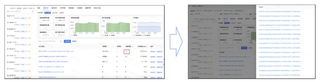 在APM平台設計上,我們將Metric數值做成了可點擊的按鈕,用户點擊即查詢出關聯到的TraceId列表,進一步點擊可看到詳細內容。
