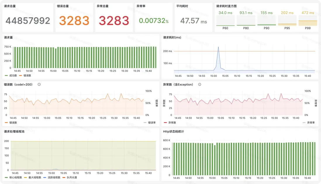 - Metric可視化:我們使用Grafana來可視化Metric數據,設計了大量直觀的Dashboard,維度包括應用總覽,各組件如HTTP、RPC、Redis、數據庫、MQ等的總覽、異常、錯誤、請求執行的圖表。如以下為某服務的請求總覽Dashboard,用户可直觀看到總量、P99、異常率、平均耗時、錯誤碼、線程池等信息,非常方便。