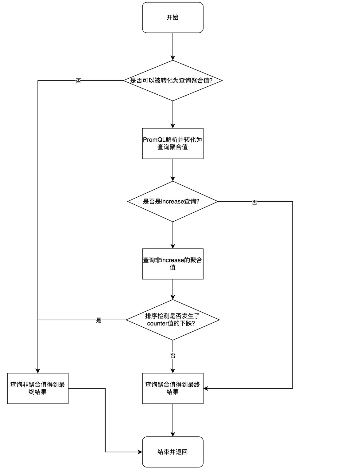 前文的問題背景介紹中已經介紹過,Counter的聚合數據在遇到increase查詢時會發生超大的突刺,我們想到在查詢時檢測和屏蔽這種情況。我們自研的Proxy查詢代理,本身的功能是自動解析修改業務的PromQL,將普通查詢轉為原始查詢,我們設計在這個轉換過程中檢測數據正確性。