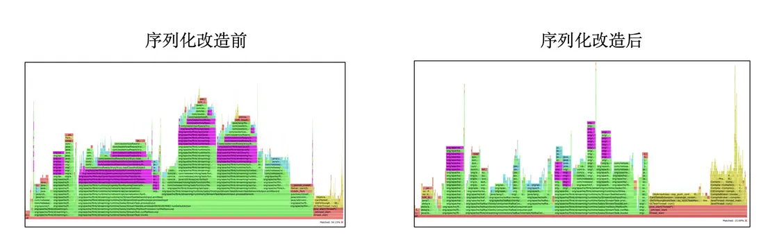 我們的聚合數據量極大,超過了250萬+QPS,且對實時性要求高,若通過簡單擴容去支撐該量級,需要的IT資源過高,故需要提高任務效率。通過火焰圖抓取可以發現,我們的任務花費了大量開銷在Function之間的序列化上,我們的數據是JavaBean,其中包含泛型的HashMap,會劣化為性能最低的Kyro序列化。我們重新抽象了數據結構,將其設計為Flink原生的Tuple類型,其中只用基本數據類型。在同樣的數據源和運行環境下對比,序列化開銷從54%降低為15%(下火焰圖中紫色部分為序列化),在物理資源不變的基礎上,任務支撐處理的輸入QPS擴大數十倍。