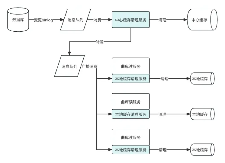 只要遵循這樣的設計,曲庫緩存的清理就可以變得比較輕巧,可以採用監聽數據庫binlog的形式進行異步清理。