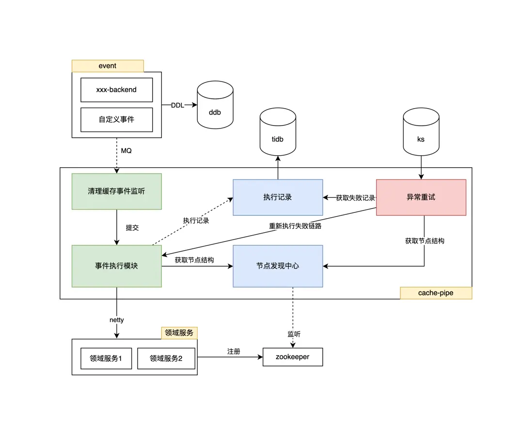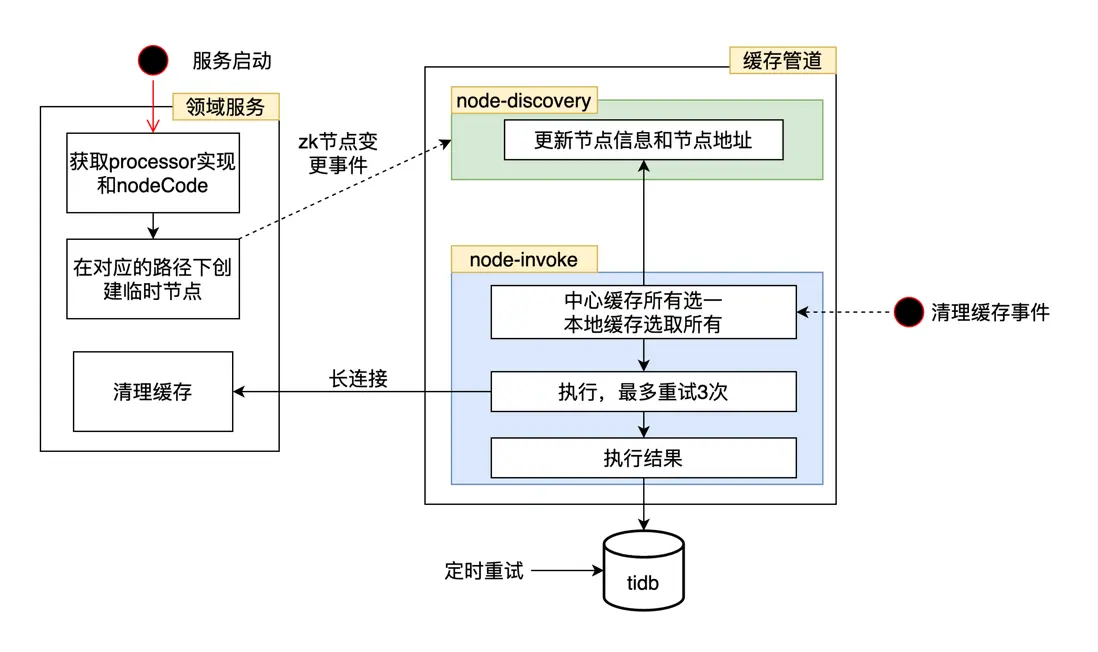 ①節點發現模塊:緩存管道通過監聽固定zk路徑下的變化事件,來維護執行緩存清理的節點信息,供執行緩存清理事件時使用。為了保證一致性,還會每隔一段時間全量