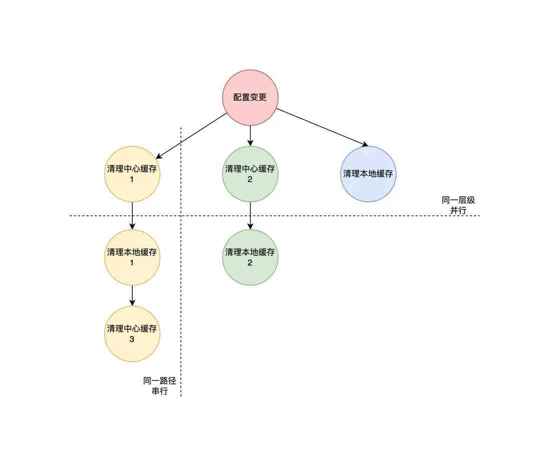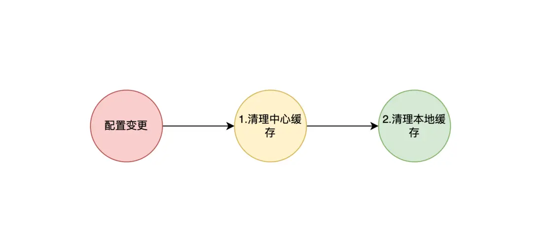 以一個最簡單的二級緩存清理為例,當配置發生變更需要清理緩存時,需要先清理二級緩存即中心緩存,然後再清理一級緩存即本地緩存,整體鏈路可以抽象為一個單向鏈表。