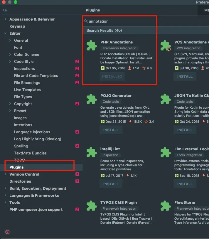 純手寫swagger註釋肯定是要不得的,太容易出錯,還需要不停的去翻看文檔參考語法,因此我們很有必要安裝一款能夠自動提示註釋中的註解語法的插件,我們常用的IDE是 phpstorm,在 phpstorm 中,需要安裝 PHP annotation 插件