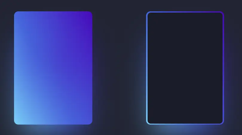 看到這樣的邊框首先要想到的是CSS本身是不支持這種效果的,所以需要從其他的地方入手,其實實現的方式很簡單,卡片黑色內容區域是一個獨立的盒子,看到的漸變邊框區域是另一個盒子,只不過內容區域的層級更高且四周都空出了邊框的距離,所以肉眼看到的是邊框。