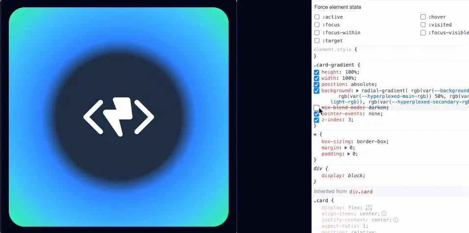 觀察文章開始的完整效果可以發現漸變顏色的區域是沒有發生變化的,因為有陰影的變化讓人感覺漸變顏色似乎也在跟着變化。這裏主要用到了混合模式,混合模式用於控制兩個圖層在疊加時的顯示方式。我們的文本mask漸變是不斷變化的,那我們只需要在卡片上再設置一個漸變背景色就可以達到混合模式的效果。