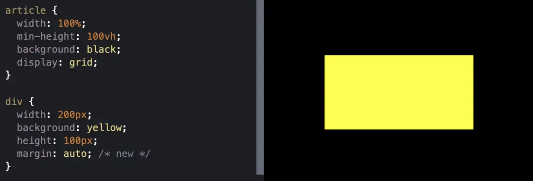 像往常一樣,我們將使用display: grid來定位父容器。我們還將使用margin: auto為div指定自動邊距。這使瀏覽器自動計算div周圍的可用空間,並在其網格單元格內垂直和水平劃分,將div放置在中間: