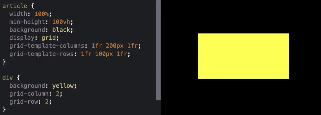 在下面所有的例子中,我們將使用display: grid屬性。這將<article>元素建立為網格容器,併為該容器生成塊級網格。我們已經將網格容器設置為寬(width: 100%)和高(min-height: 100vw),這樣我們的div就有足夠的空間在其中移動。
