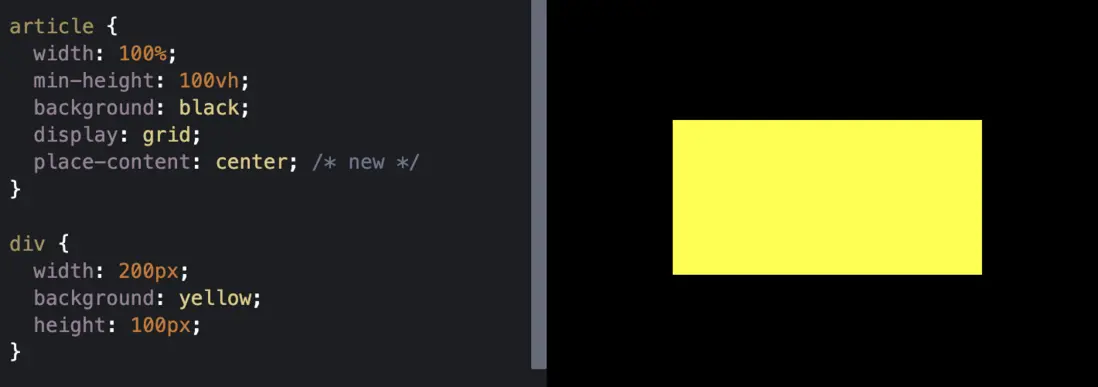 place-content屬性是justify-content(水平)和align-content(垂直)的簡寫。雖然place-self和place-items控制網格項如何放置在其指定的網格單元格中,但place-content指定網格容器的整個內容應如何對齊(即,所有網格項被視為一個組)。在我們的演示中,只有一個網格項(我們的單個黃色div),因此我們也可以使用place-content將其置於其容器的中心。