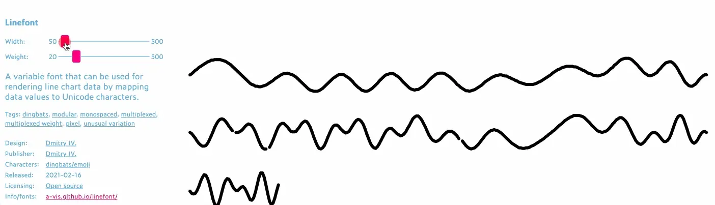 這個字體就是一條波浪線,通過調整Width軸可以改變波浪的大小和幅度,都可以基於這個可變字體做水波紋效果了。
