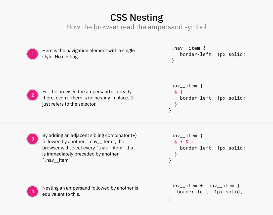 CSS原生嵌套的一個好處是可以使用組合器。讓我們來看一些例子。