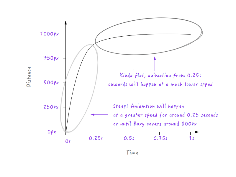 To start off with, we know that at 0 seconds, when the animation has not yet started, Boxy is in its initial position (0 pixels). And after 1 second has passed, Boxy has travelled a total of 1000 pixels, landing at the opposite edge of the display.