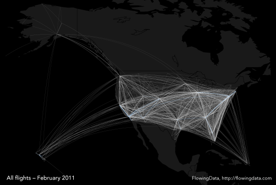For example, here’s a map that shows where major airlines flew in the United States during February 2011.