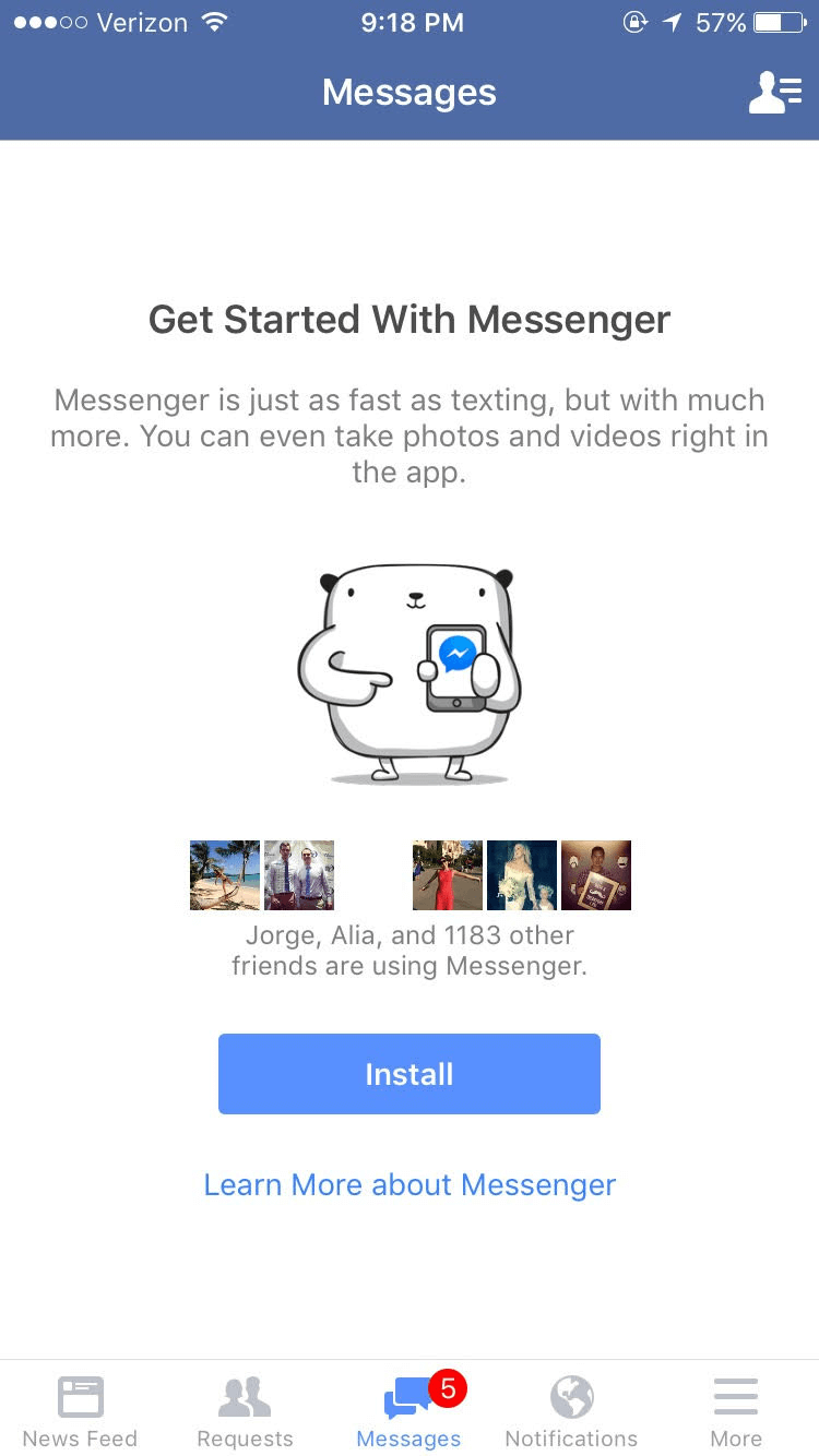 Let's examine the install screen of Facebook Messenger. When users arrive at this screen, they are met with encouragement – the screen lets users know the benefits of the product (a user can take pictures or record video using Messenger) and tells them how many of their Facebook friends are already using the app. The ‘Install' button guides users onto the next step necessary to clear up the empty state. Users simply have no other option than to touch install.