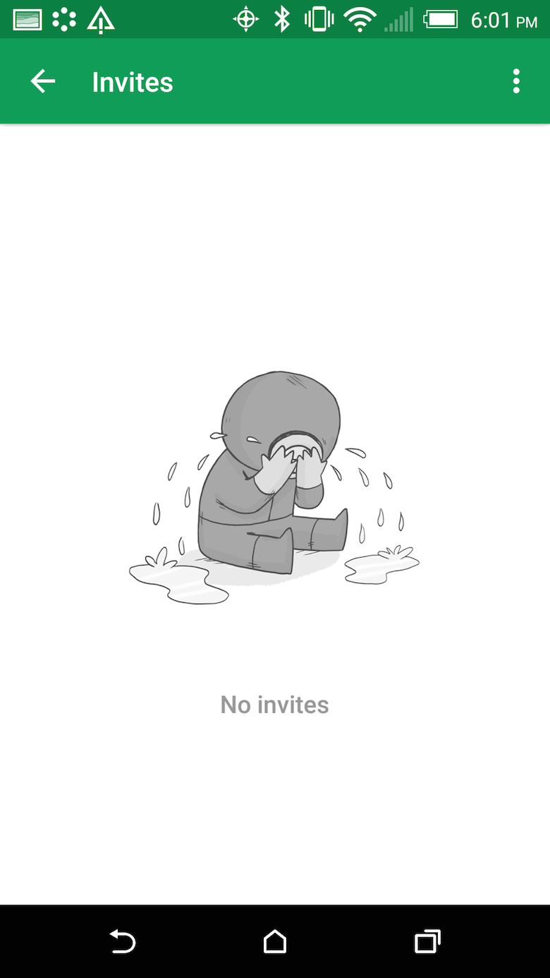 Empty states can help you show the human side of your business or product. Positive emotional stimuli can build a sense of engagement with your users. What kind of feeling your empty state conveys, depends on the purpose of your app. An example below shows the emotional side of empty state in Google Hangouts and how it can incentivize users to get invites on Hangouts.