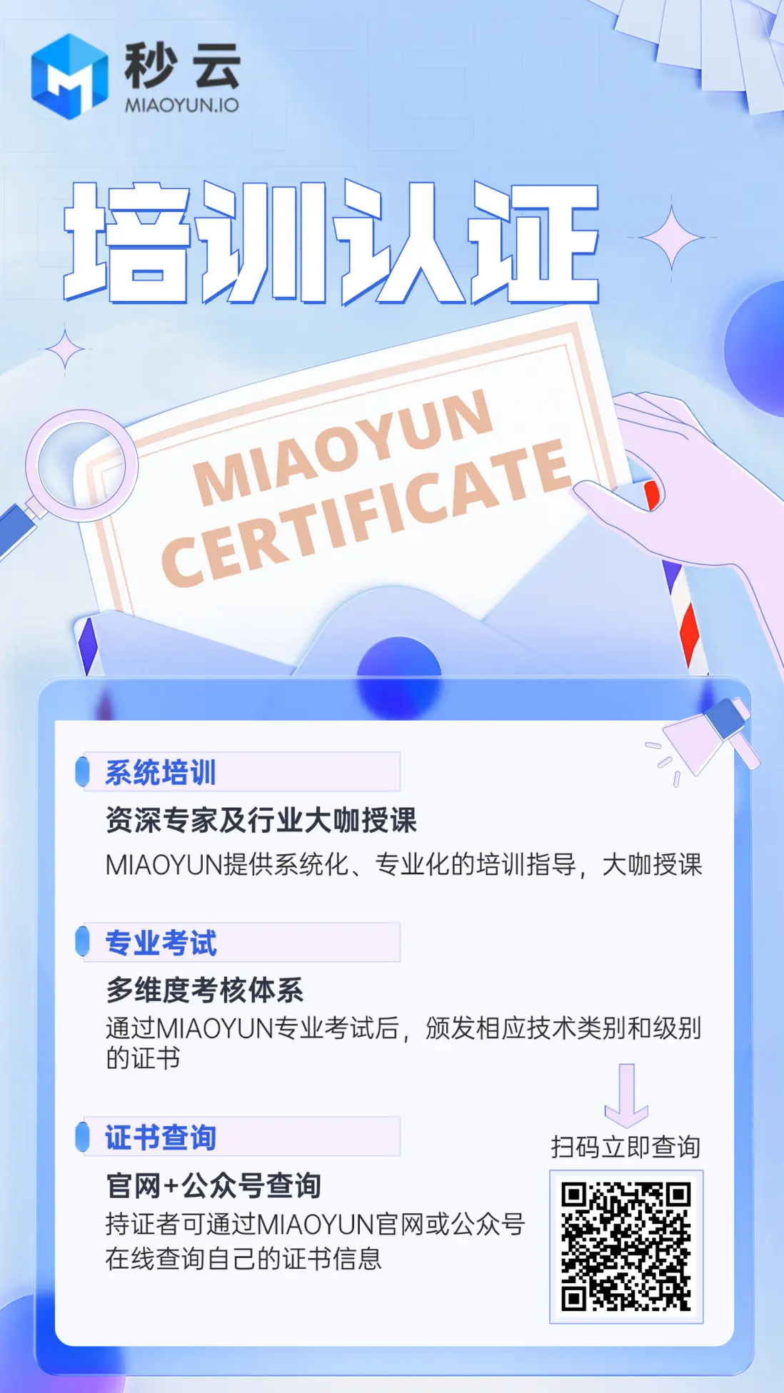 為了進一步提升專業培訓的層次與深度,本期MIAOYUN培訓認證特採取定向邀約制,暫不開放個人直接報名渠道。我們誠邀各界追求卓越、致力於提升團隊專業能力的傑出企業,統一組織並聯系我們,共同參與這一精英匯聚、知識碰撞的學習之旅。關注【MIAOYUN秒雲】公眾號,發送關鍵字“培訓認證”即可獲取報名方式,期待與您相遇,共同探索技術的無限可能!