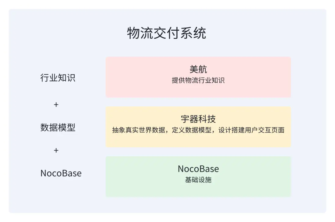在這個共同交付的項目中,美航提供物流行業的專業知識,宇器科技負責數據建模和用户界面設計,而 NocoBase 則提供基礎設施支持。通過這種架構,整個物流交付系統可以高效、靈活地開始進行構建。