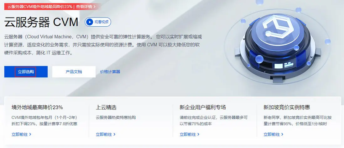 首先打開雲服務器CVM頁面,點擊“立即選購”,如下圖: